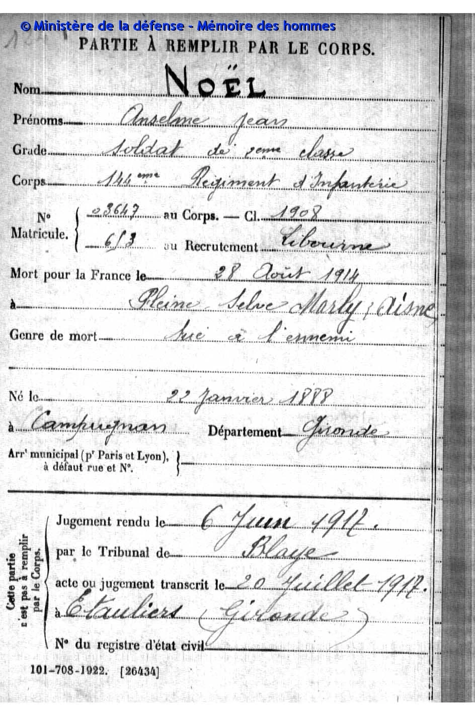 Als soldaat 2de klasse van het 144ste Infanterieregiment sneuvelde hij op 28 augustus 1914 in Marly (Pleine Selve, Aisne). Zijn overlijden werd vastgesteld door een vonnis van de rechtbank van Blaye op 6 juni 1917 en overgeschreven te Etauliers op 20 juli 1917.