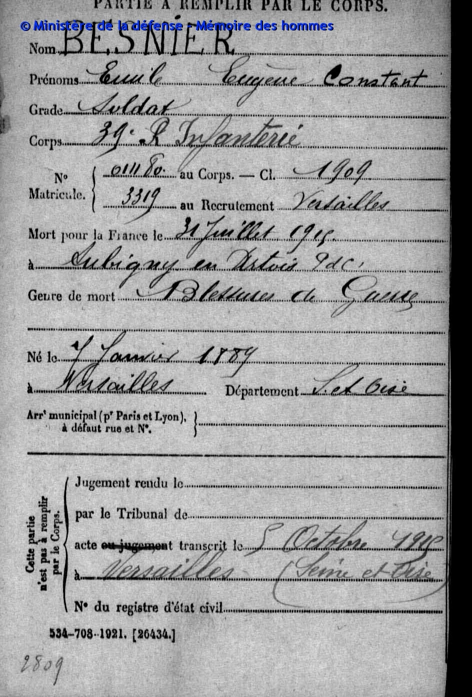 Als soldaat van het 39ste Infanterieregiment stierf hij aan zijn verwondingen op 31 juli 1915 te Aubigny-en-Artois.