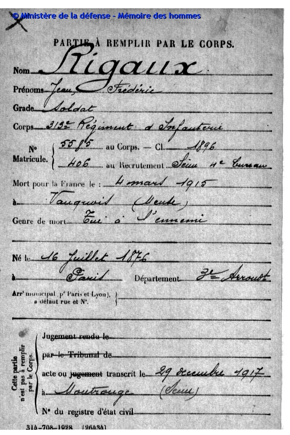 Hij sneuvelde te Vauqouis (Meuse) op 4 maart 1915 als soldaat van het 313de Infanterieregiment.